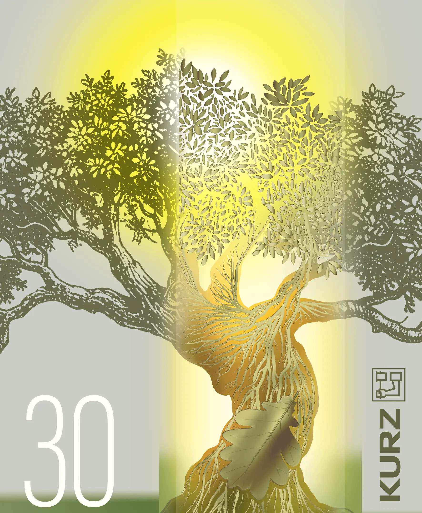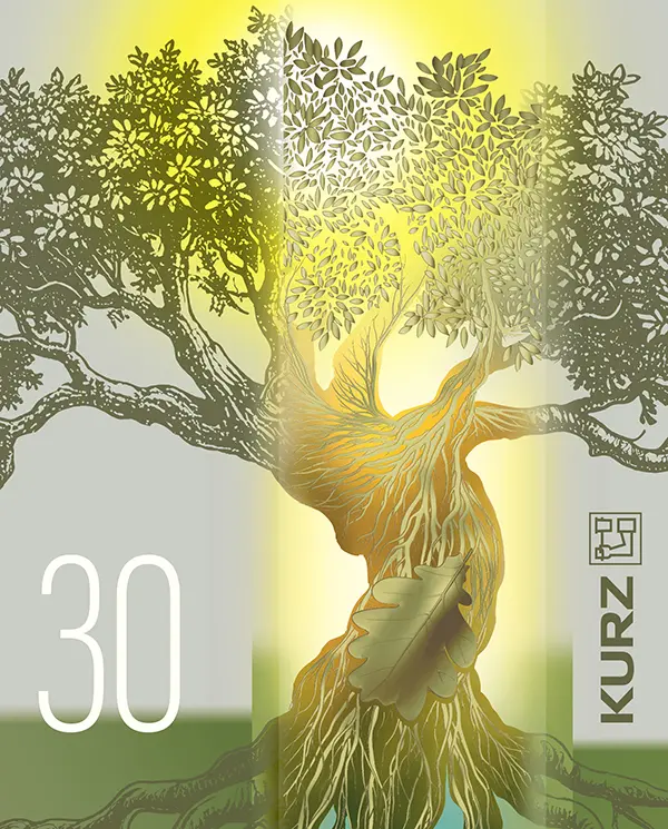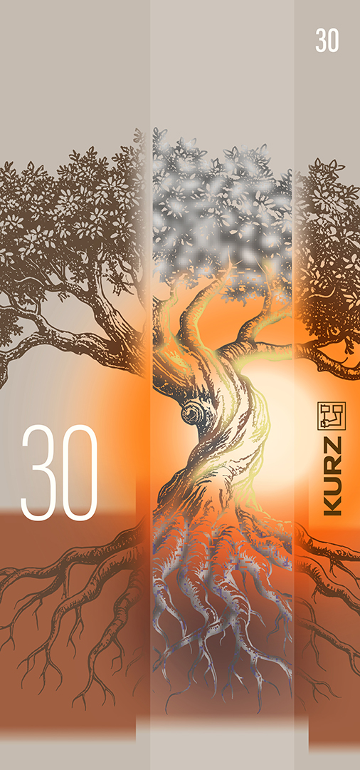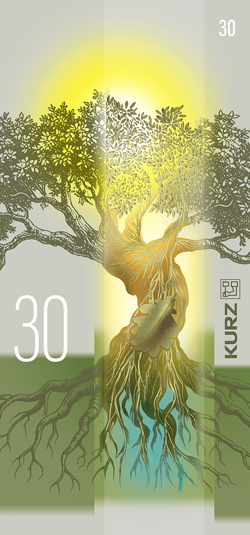 To celebrate 30 years of security production in Sulzbach-Rosenberg, Kurz Banknote Security has created a special anniversary note series: Tree of Life. The design centers around the tree as a powerful symbol — representing growth, stability, and deep roots in the region. It reflects the cycle of continuous innovation, from strong foundations to new branches of technology. Each note reinterprets this symbol, showing how Kurz has constantly reinvented itself over the years. The series honors the past while looking forward to a dynamic, secure future.