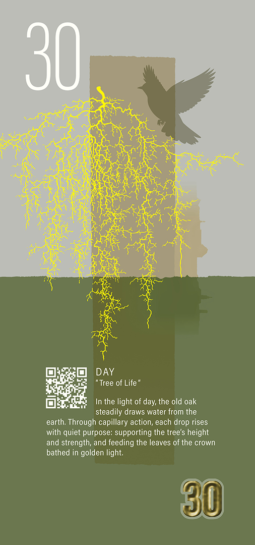 In the light of day, the old oak steadily draws water from the earth. Through capillary action, each drop rises with quiet purpose: supporting the tree’s height and strength, and feeding the leaves of the crown bathed in golden light.