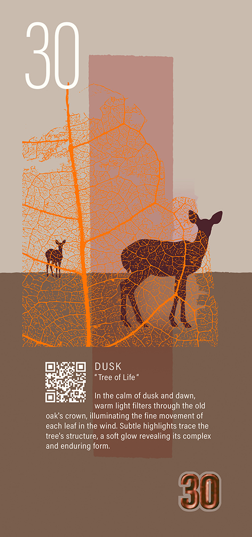 In the calm of dusk and dawn, warm light filters through the old oak's crown, illuminating the fine movement of each leaf in the wind. Subtle highlights trace the tree's structure, a soft glowrevealing its complex and enduring form.